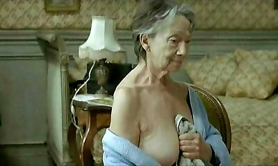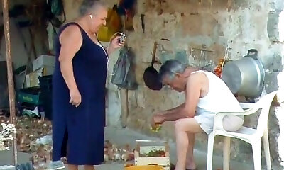 молодой жиголо сверлит старшую супер-озорную бабушку маршу и дует грузом на ее лицо и отвисшие веселые сумки
