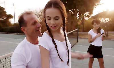Horny trainer ravages duo of sexy slender girlies after nice tennis game
